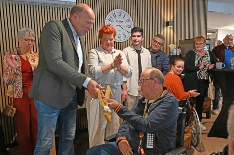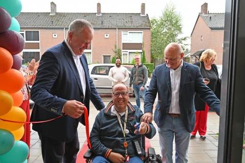 Voor de bewoners stond een belangrijke taak op het programma. Naast het rondleiden van de genodigden door hun huis, moest er ook een officiële openingshandeling voltooid worden. Mei 2023, bij de start van de bouw, overhandigden toekomstige bewoners van WBC Mundium een symbolische sleutel aan aannemer Smeets Bouw. Een prachtige gouden sleutel, gemaakt door een van de bewoners, werd in bewaring gegeven. Deze sleutel werd afgelopen maandag weer teruggegeven. Bewoner Pedro nam de sleutel trots in ontvangst namens alle bewoners. Een mooi symbolisch moment. Ook werd er nog een lintje doorgeknipt bij de ingang. De feestelijke middag werd afgesloten met een gezellig samenzijn onder het genot van een hapje en drankje.
